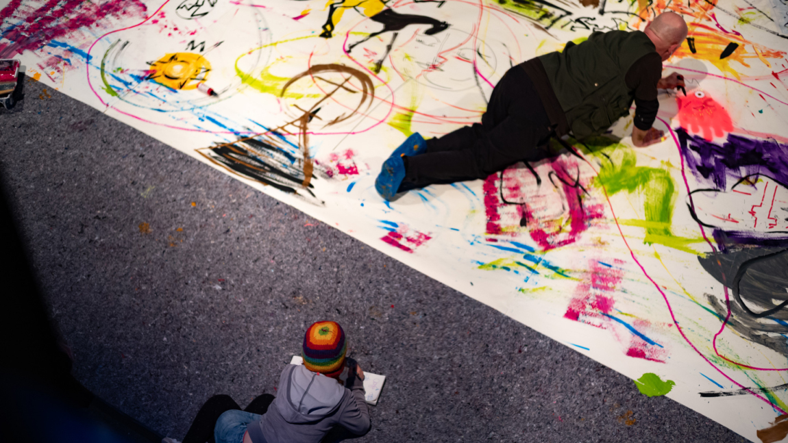 Was sich sonst hinter geschlossenen Ateliertüren vollzieht, wird an diesem Abend zum öffentlichen Happening mit Livemusik. Die Spielfläche: ein Papierquadrat von 8 mal 8 Metern auf dem Fußboden des Nikolaisaal-Foyers. Mit den ersten »Planeten«-Klängen des Max Doehlemann Quintetts beginnt ein faszinierendes Spektakel, bei dem sich fünf Künstlerinnen unmittelbar von der Musik inspirieren lassen und vor aller Augen ein »kosmisches« Gemeinschaftswerk erschaffen. Ein lustvoll beflügelndes Match nicht nur zwischen Musik und Bildender Kunst, sondern auch zwischen den Akteurinnen und ihrem Publikum!